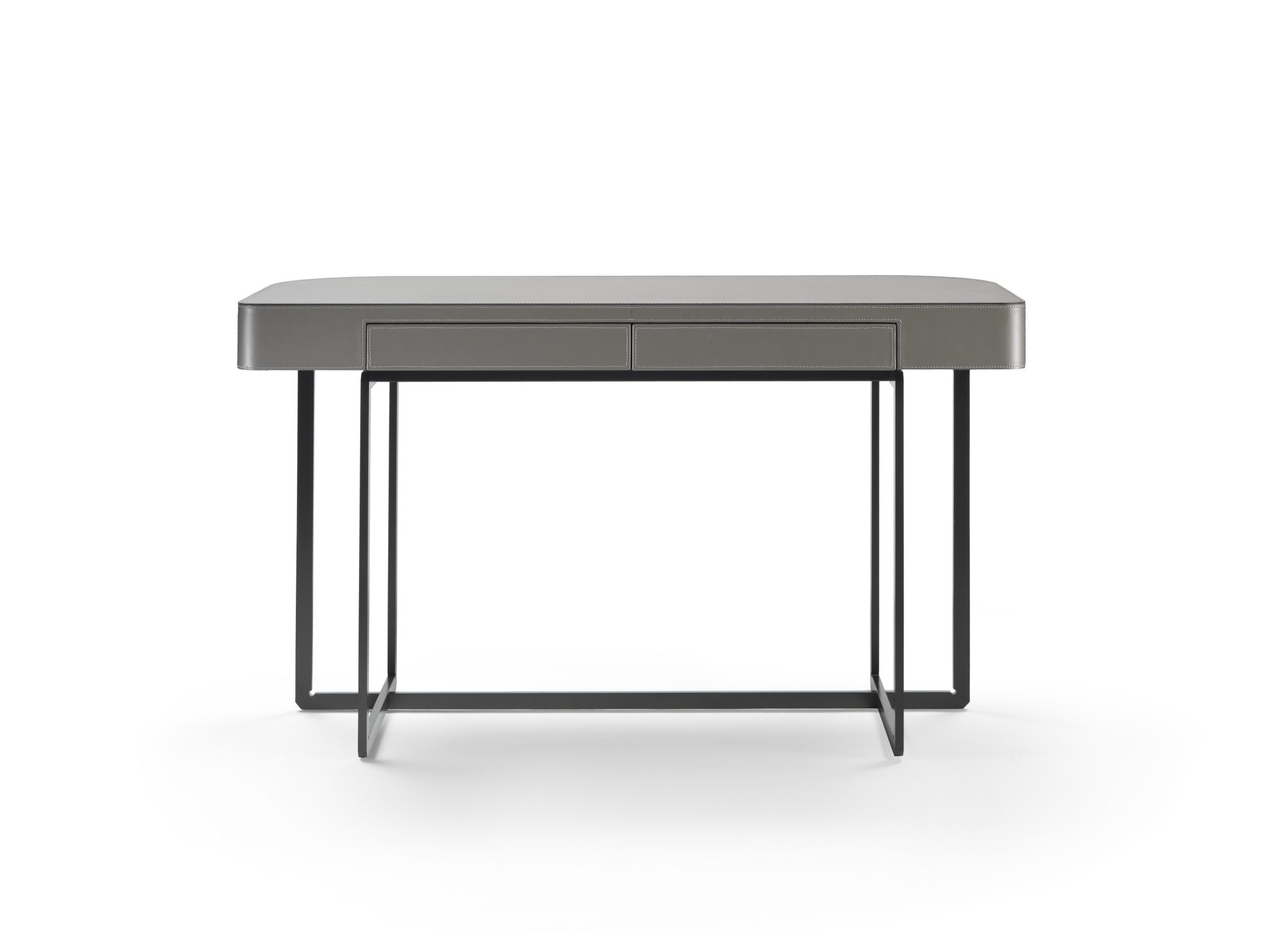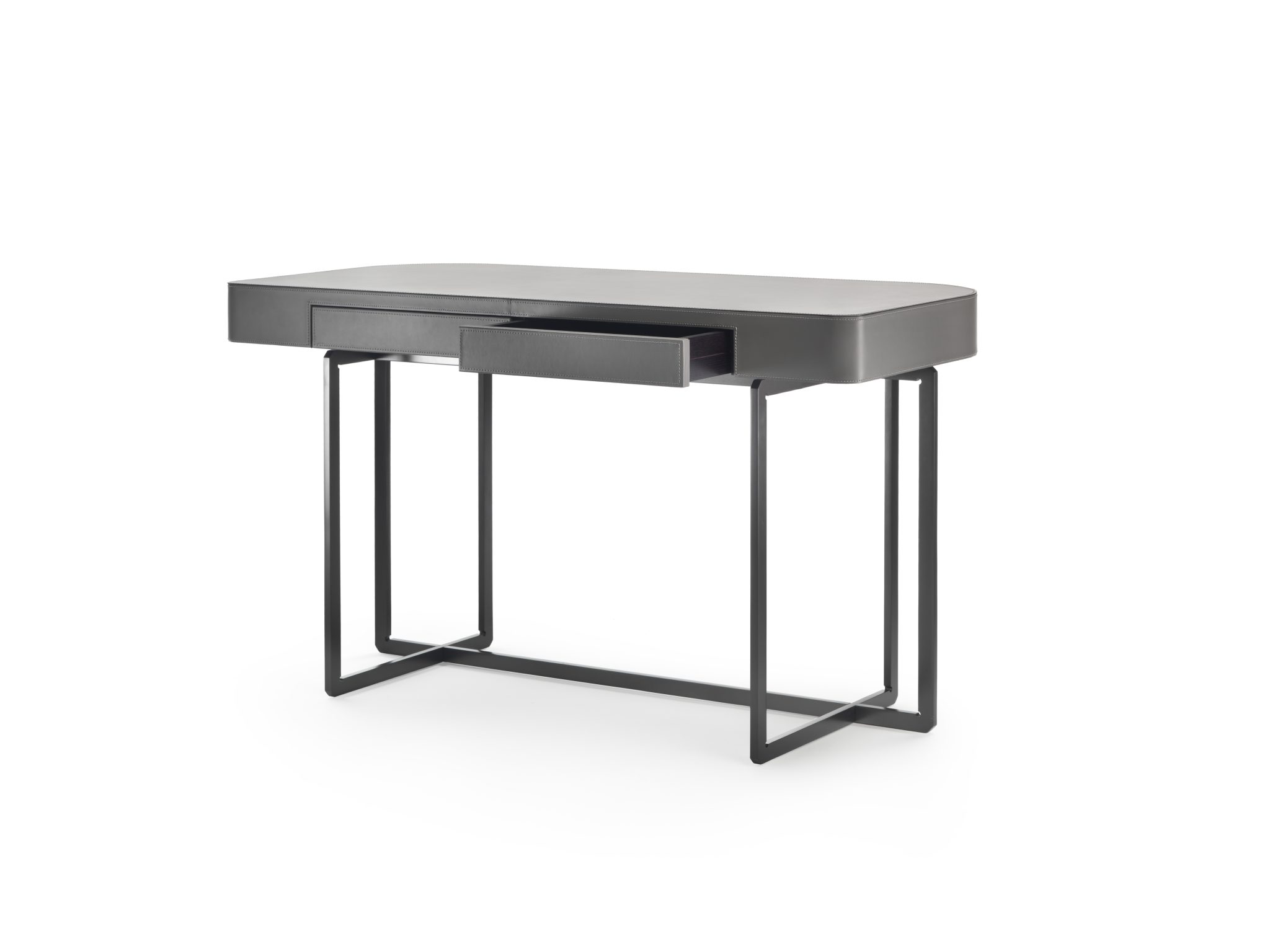 Small desk with drawers on the same metal base as the tables, with an elegant top clad in cowhide. A gem of an object that can resolve the needs of a home-office in an apartment, or add an elegant touch to the rooms in a boutique hotel.
