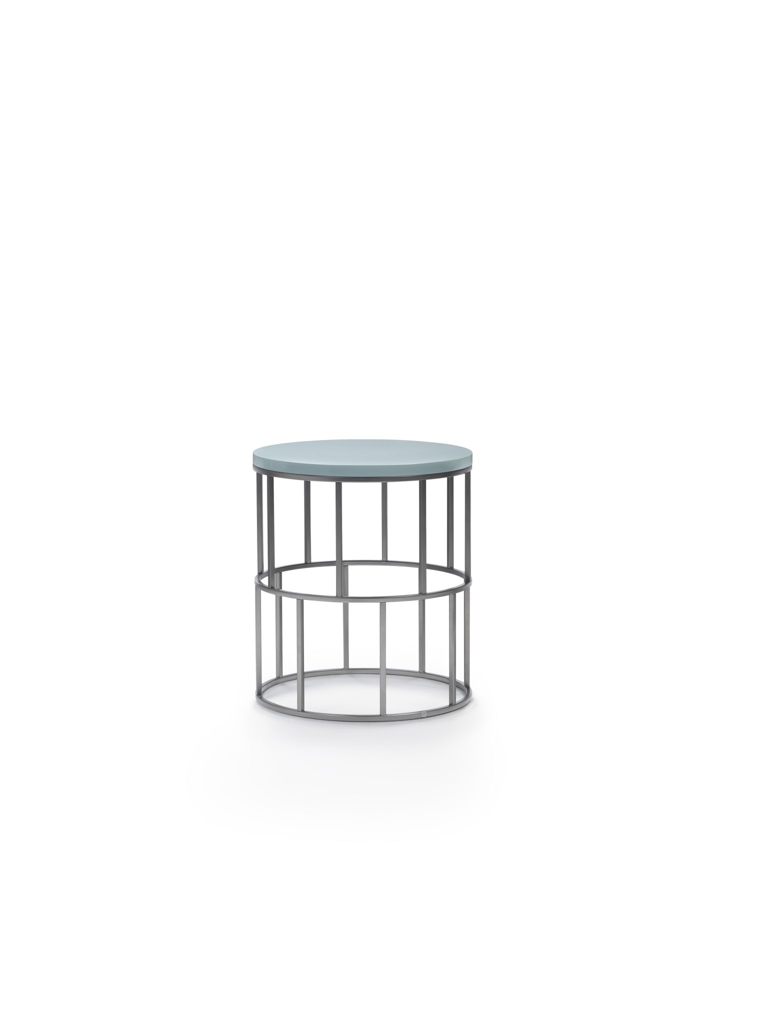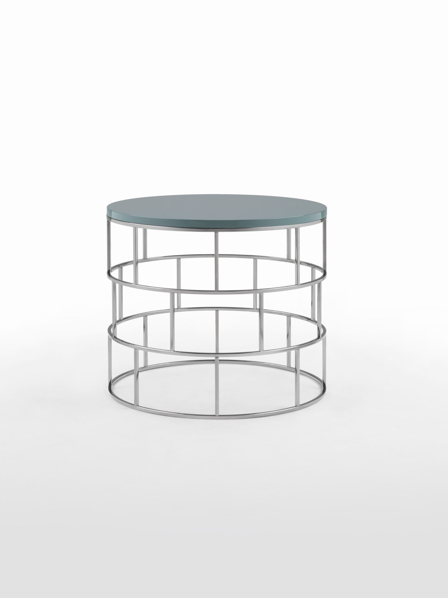 The circular support, slender and light in appearance, hosts tops in wood or marble, or upholstery to transform the table into an