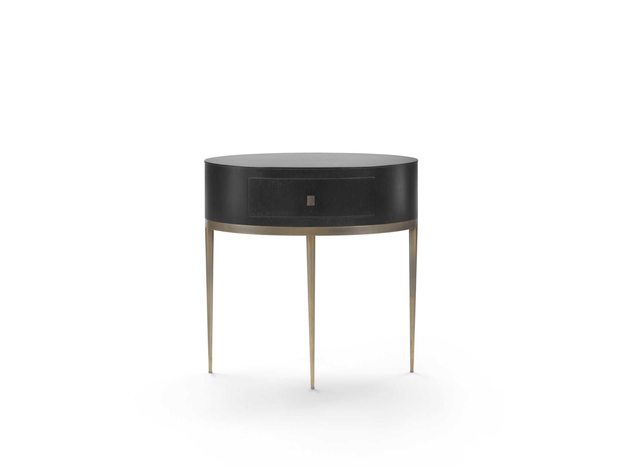 A slender, elegant round table with structure inbronze-finish metal and top in travertine. The slender metal legs make it minute but precious.